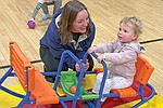 Emily Loasby of St. Germain watches her 2-year-old daughter, Nora, play on the teeter totter during GymTime in the gymnasium …