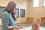 Karen Merrill, youth services assistant at the Minocqua public library, deals the cards to Isabele Foss, 7, for the next …